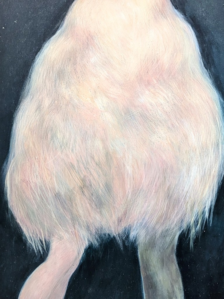 * This was my favorite lens with which to view these images. With two legs and two sides each, the portraits see each subjects’ pyramidal structures split into two halves. Both subjects are made of three distinct parts, however; Jesus is the Son, Father, and Holy Spirit, whereas the furry blob is presumably a woman, a man, and their wooly cover. Jesus’s middle part is also strong enough to cut the image in half, were the dual-toned strobe light not present.